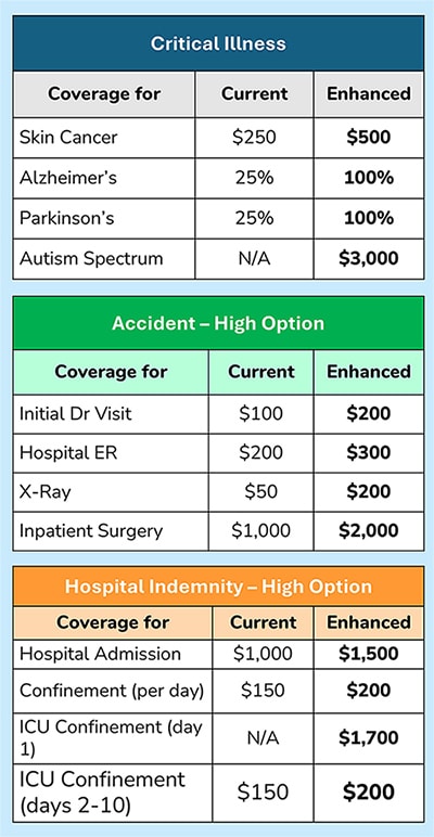 Voluntary benefits through Aflac are enhanced with no rate increases in 2026 as shown below. In addition, you can now choose critical illness coverage up to $50,000.