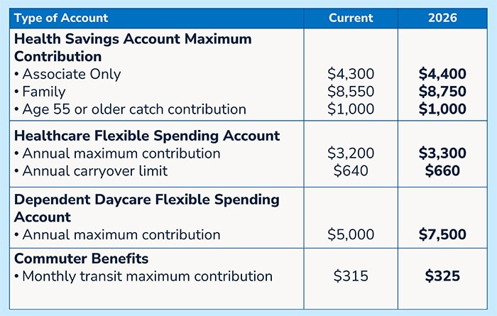 Annual contribution limits for the health savings account (HSA), flexible spending accounts (FSAs) and commuter benefits are increasing in 2026 to help you save more on eligible healthcare, dependent daycare and commuter expenses.
