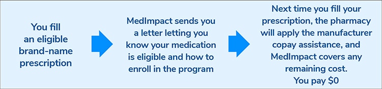 Through the MedImpact Assist Non-Specialty copay assistance program, MedImpact will help you enroll in a manufacturer copay assistance program and subsidize any remaining copay after the manufacturer discount is applied, so you will pay $0 for eligible medications.