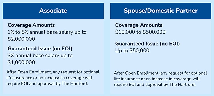During this year’s Open Enrollment, associates can elect coverage for themselves and their spouse/domestic partner up to the same guaranteed issue amounts as new hires enrolling for the first time without evidence of insurability (EOI).