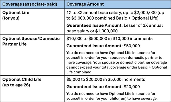 You can purchase optional life insurance for yourself and your eligible family members in the amounts shown below. If you and your spouse or domestic partner are both employed by an Albertsons-affiliated employer, you may cover yourself under optional life or your spouse or domestic partner may cover you under optional spouse/domestic partner life. Associates cannot be covered as both an associate and a spouse or domestic partner.