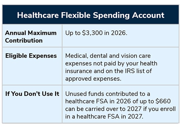 A healthcare FSA can help you save money on eligible healthcare expenses and lower your taxable income. By anticipating your expenses and arranging for deductions to be made from your paycheck each pay period, you lower your tax bill. In 2026, you can set aside up to $3,300 on a pre-tax basis.